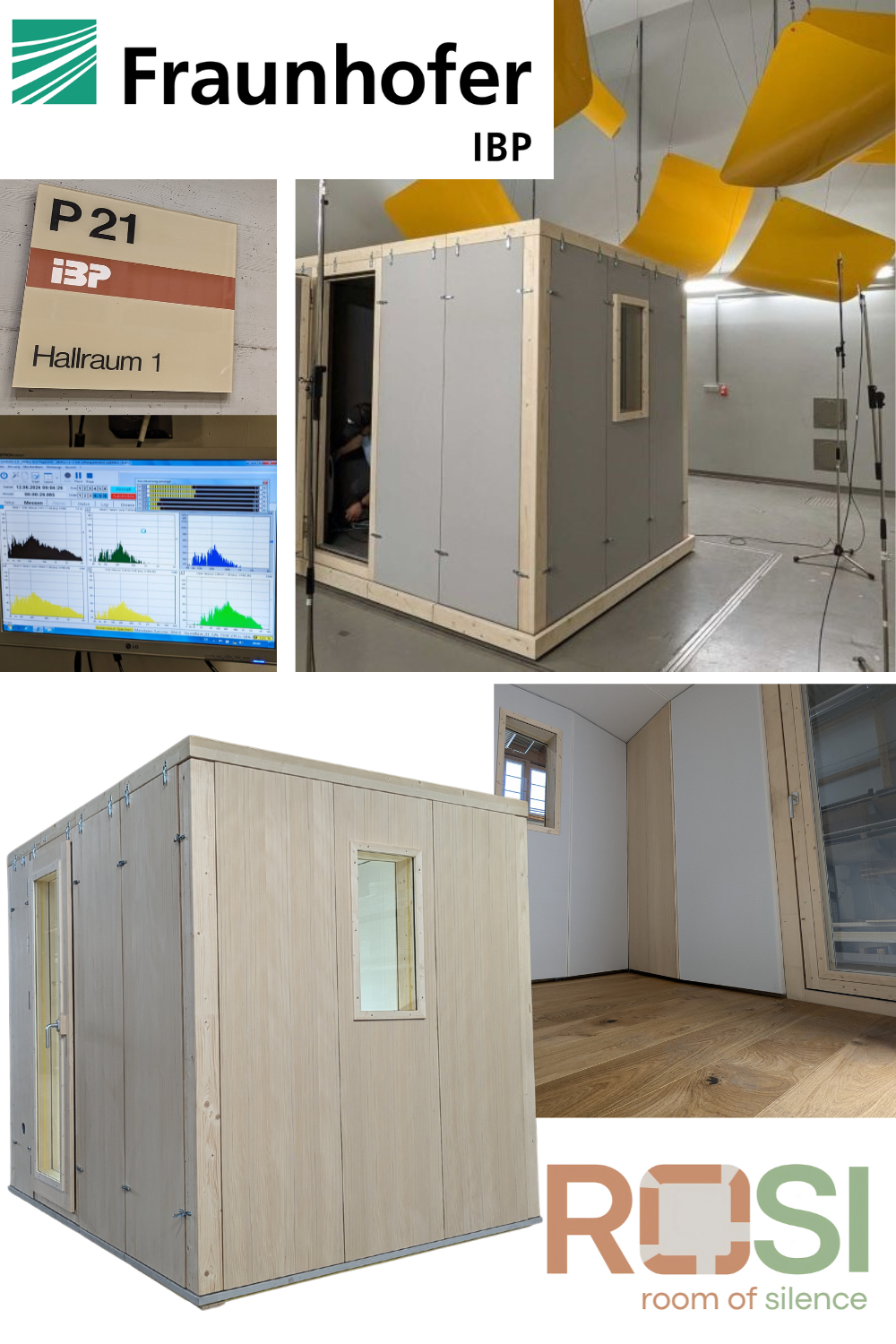 STUDIOBOXes have been tested at the IBP for decades – especially regarding sound level reduction (photo in the reverberation chamber). In 2024, a joint research project was launched for the first time. The goal was to develop a truly sustainable, ecological booth that – excluding seals, fittings, and glass – is made entirely of wood and achieves the same high sound insulation values as the proven booths across the relevant frequency spectrum.